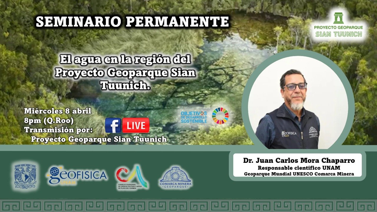 El agua en la región del Proyecto Geoparque Sian Tuunich. El Geoparque Mundial de la UNESCO Comarca Minera se suma a la difusión del Seminario Permanente del Proyecto Geoparque Sian Tuunich. En esta ocasión,el Dr. Juan Carlos Mora Chaparro, responsable científico de nuestro Geoparque e investigador del Instituto de Geofísica de la UNAM impartirá la conferencia “El agua en la región del Proyecto Geoparque Sian Tuunich”. Miércoles 08 de abril de 2026 8:00 p.m. (hora Quintana Roo) Transmisión: FB Live Proyecto Geoparque Sian Tuunich Los invitamos a seguir esta conferencia que abordará la importancia del agua desde una perspectiva científica y territorial en el contexto de los geoparques.